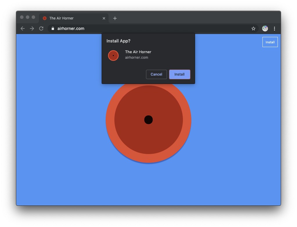 For this API to work, you need a PWA that is installed to the home screen, so the first step is to install a PWA, such as the infamous, world-famous airhorner.com. Hit the Install button in the top-right corner or use the three-dots menu to install manually.
