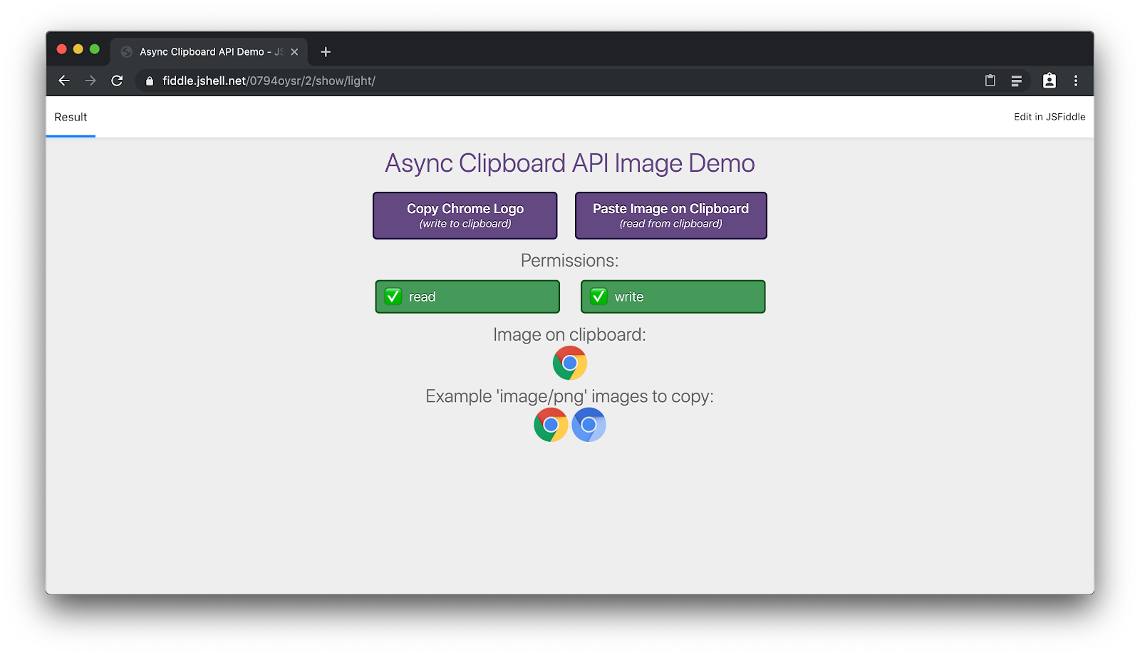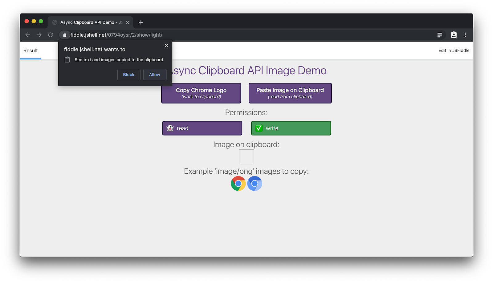 You can see this API in action in a demo app, the relevant snippets from its source code are embedded above. Copying images into the clipboard can be done without permission, but you need to grant access to paste from the clipboard.