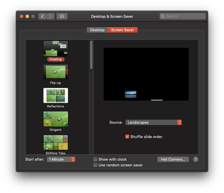 To test the Wake Lock API, you must first ensure that your device would go to sleep. Therefore, in your operating system's preference pane, activate a screensaver of your choice and make sure that it starts after 1 minute. Make sure that it works by leaving your device alone for exactly that time (yeah, I know, it's painful). The screenshots below show macOS, but you can of course try this on your mobile Android device or any supported desktop platform.