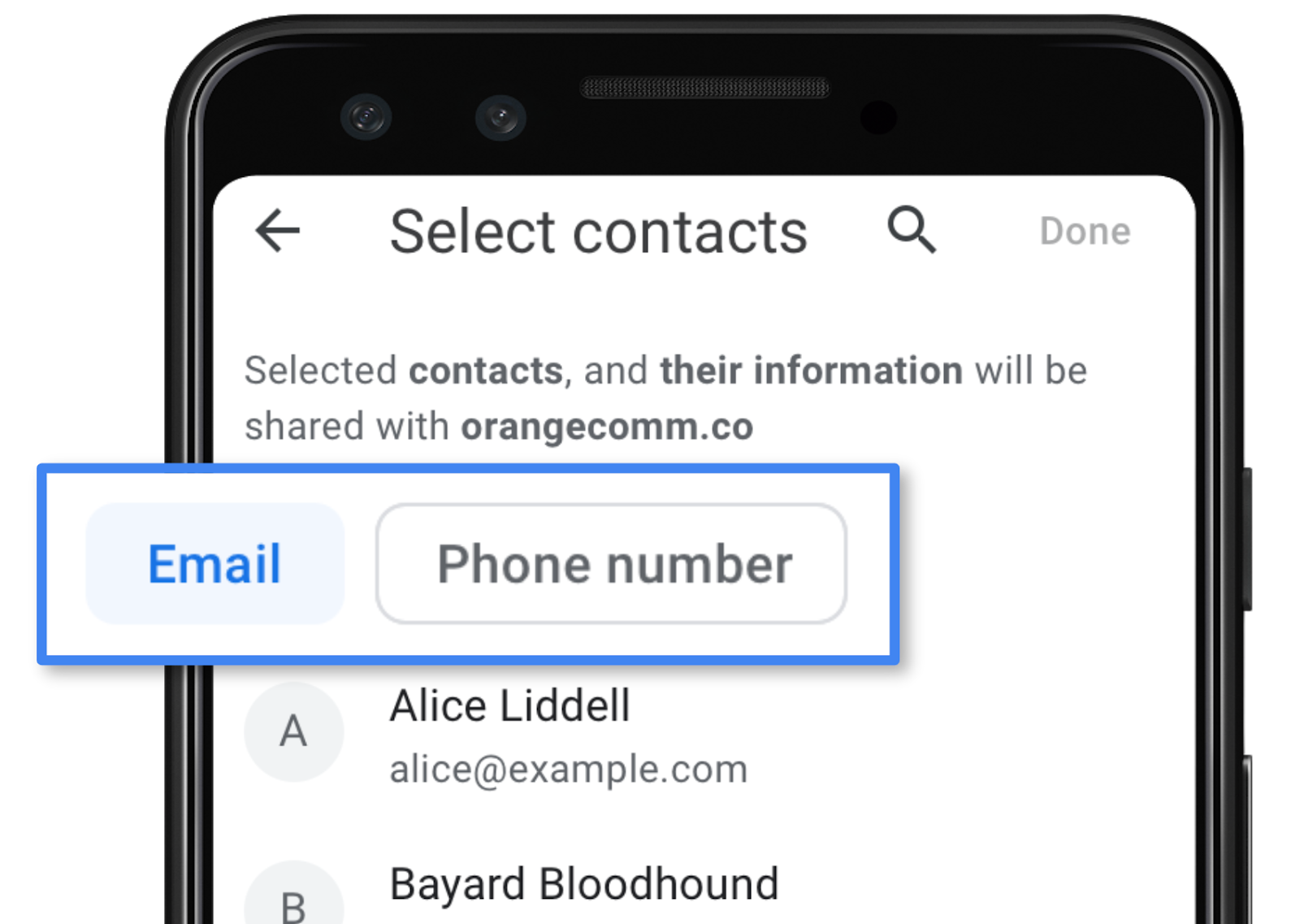 Once the picker opens, you can select the contacts you want to share. You will note that there is no "select all" option, which is deliberate: we want sharing to be a conscious decision. Likewise, access is not continuous, but rather a one-time decision.