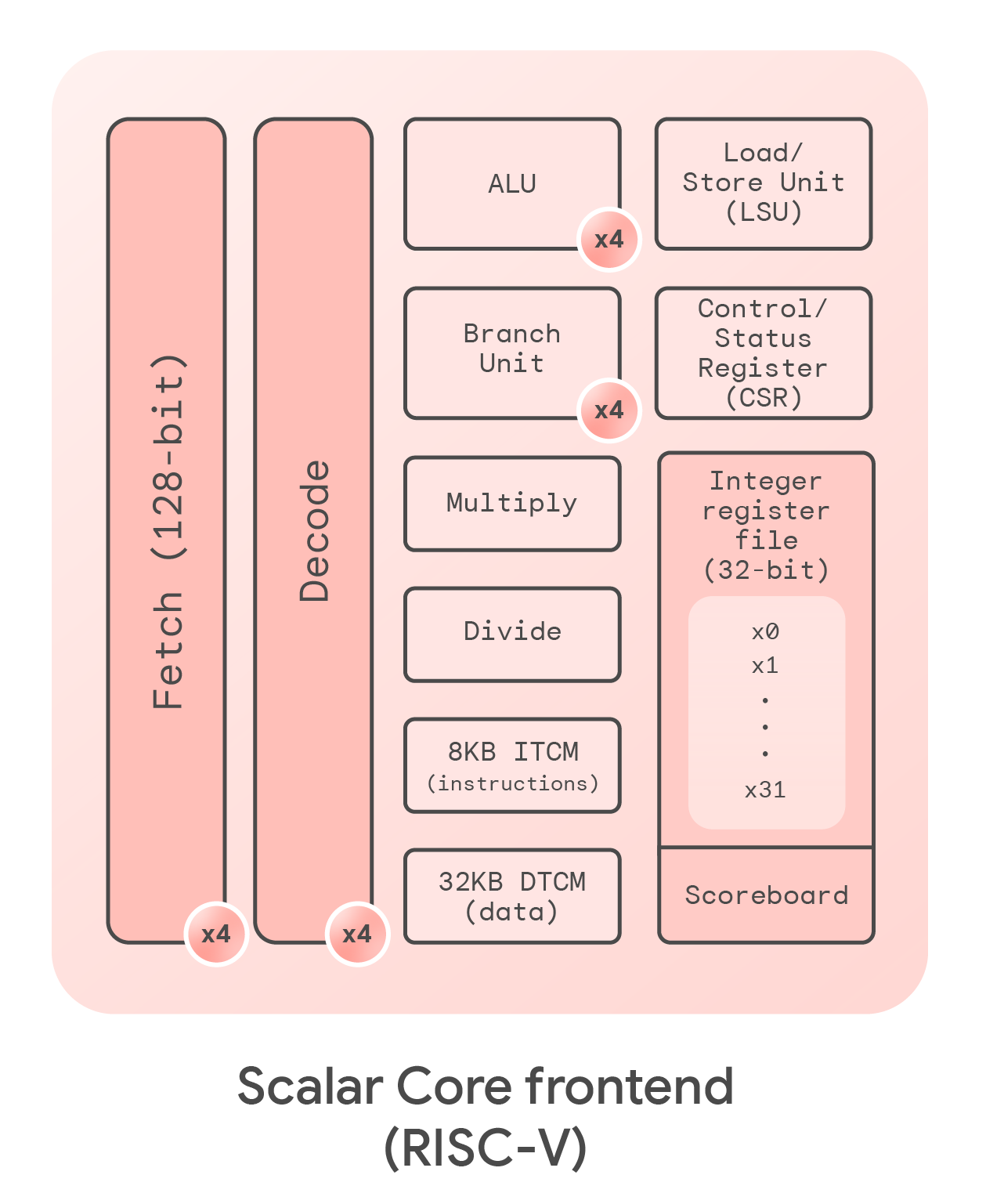 Coral NPU is a RISC-V CPU built for custom single-instruction, multiple data (SIMD) instructions and microarchitectural features that align with the dataplane properties of an ML accelerator. The design of Coral NPU starts with domain and matrix capabilities—vector and scalar capabilities are then added for a fused architecture.