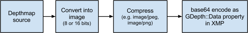 A depthmap is serialized as a set of XMP properties. As part of the serialization process, the depthmap is first converted to a traditional image format. The encoding pipeline contains three steps (see Figure 2):