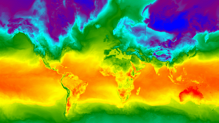 L'esempio seguente illustra la generazione di un'animazione che mostra le temperature globali nel corso di 24 ore. Tieni presente che questo esempio include gli argomenti di visualizzazione insieme agli argomenti di animazione, anziché mappare prima una funzione di visualizzazione su ImageCollection