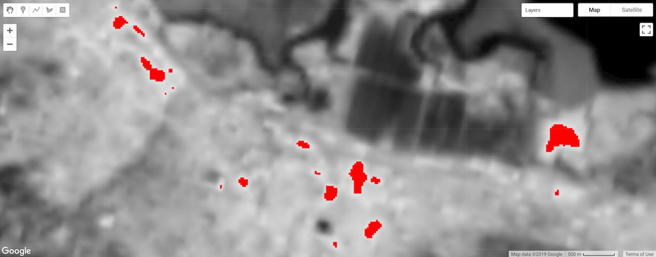 # Threshold the `object_area` image to define a mask that will mask out # objects below a given size (1 hectare in this case). area_mask = object_area.gte(10000) # Update the mask of the `object_id` layer defined previously using the # minimum area mask just defined. object_id = object_id.updateMask(area_mask) map_objects.add_layer(object_id, None, 'Large hotspots')