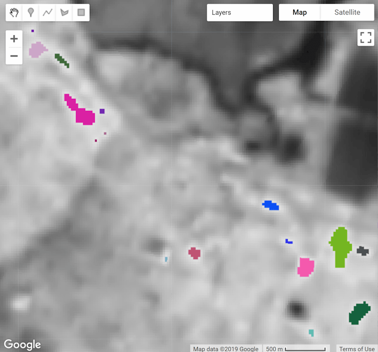 # Uniquely label the hotspot image objects. object_id = hotspots.connectedComponents( connectedness=ee.Kernel.plus(1), maxSize=128 ) # Add the uniquely ID'ed objects to the map. map_objects.add_layer(object_id.randomVisualizer(), None, 'Objects')