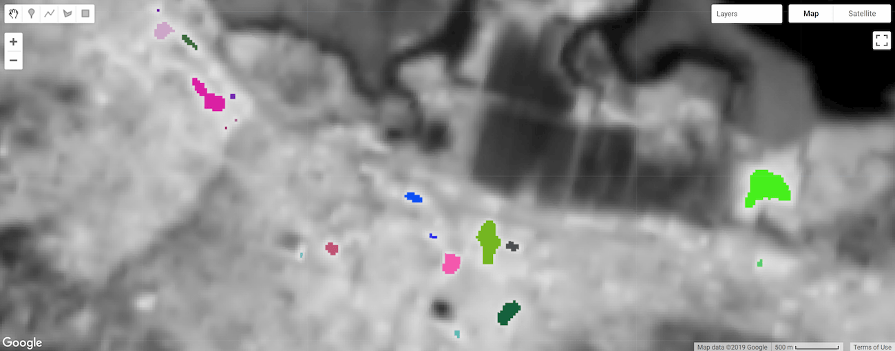 # Uniquely label the hotspot image objects. object_id = hotspots.connectedComponents( connectedness=ee.Kernel.plus(1), maxSize=128 ) # Add the uniquely ID'ed objects to the map. map_objects.add_layer(object_id.randomVisualizer(), None, 'Objects')