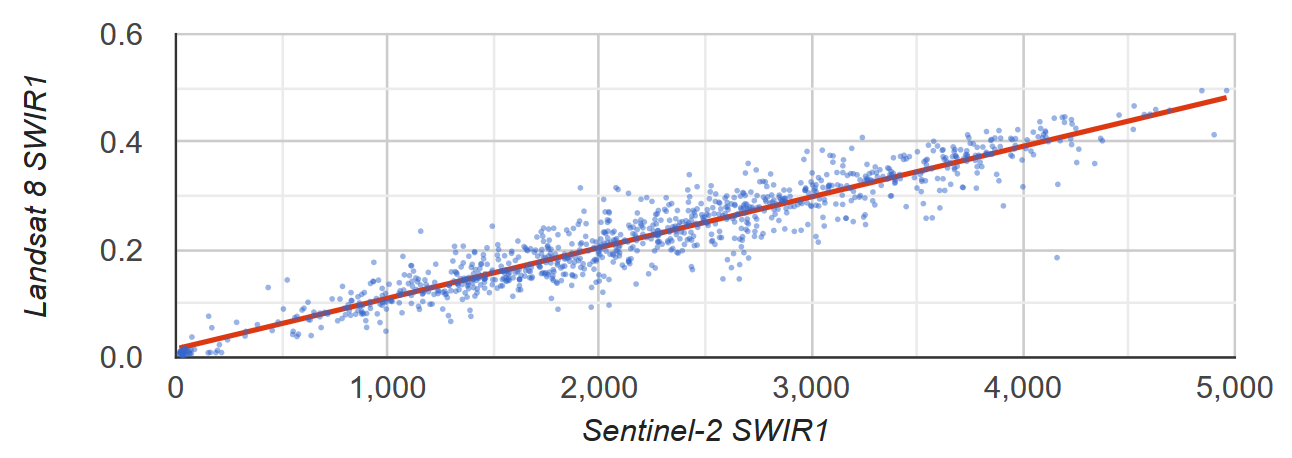 สมมติว่าคุณต้องการทราบความสัมพันธ์เชิงเส้นระหว่างการสะท้อนแสง SWIR1 ของ Sentinel-2 กับ Landsat 8 ในตัวอย่างนี้ ระบบจะใช้ตัวอย่างพิกเซลแบบสุ่มที่จัดรูปแบบเป็นคอลเล็กชันจุดของฟีเจอร์เพื่อคํานวณความสัมพันธ์ ระบบจะสร้างผังกระจายของคู่พิกเซลพร้อมกับเส้นค่าเฉลี่ยสัมบูรณ์น้อยสุด (Least Squares) ที่พอดีที่สุด (รูปที่ 2)