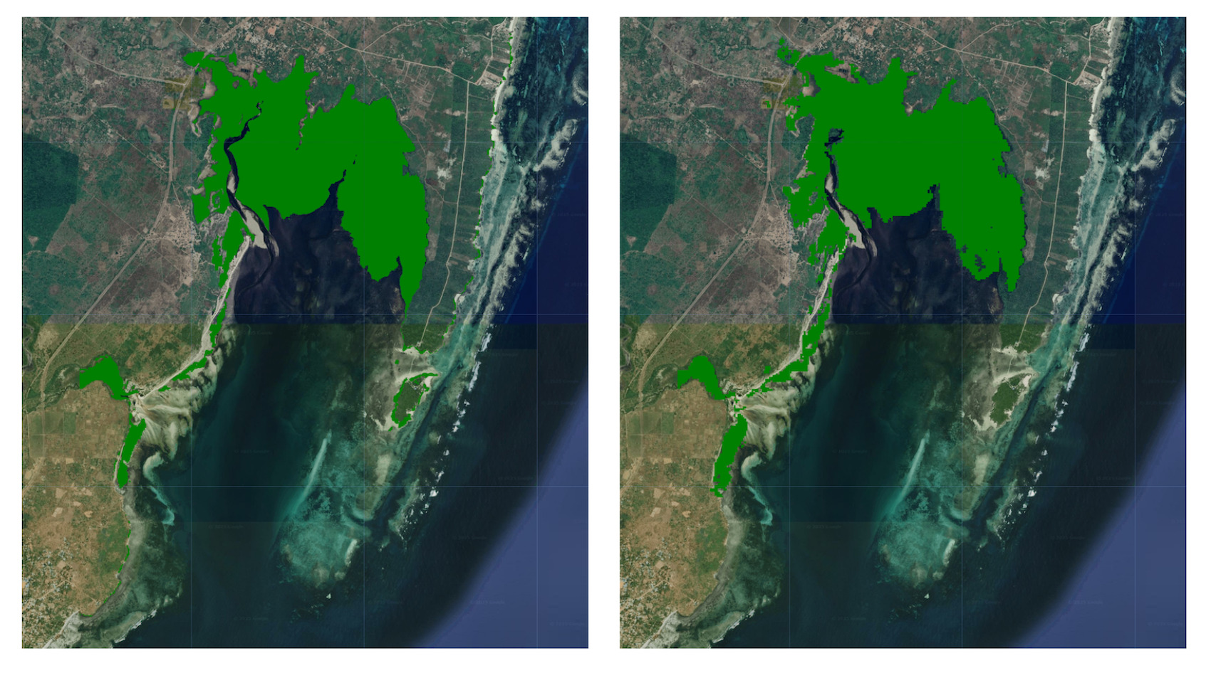 الشكل: (على اليمين) خريطة أشجار المانغروف من عمليات التضمين المستندة إلى صور الأقمار الصناعية (على اليسار) خريطة أشجار المانغروف من GMW