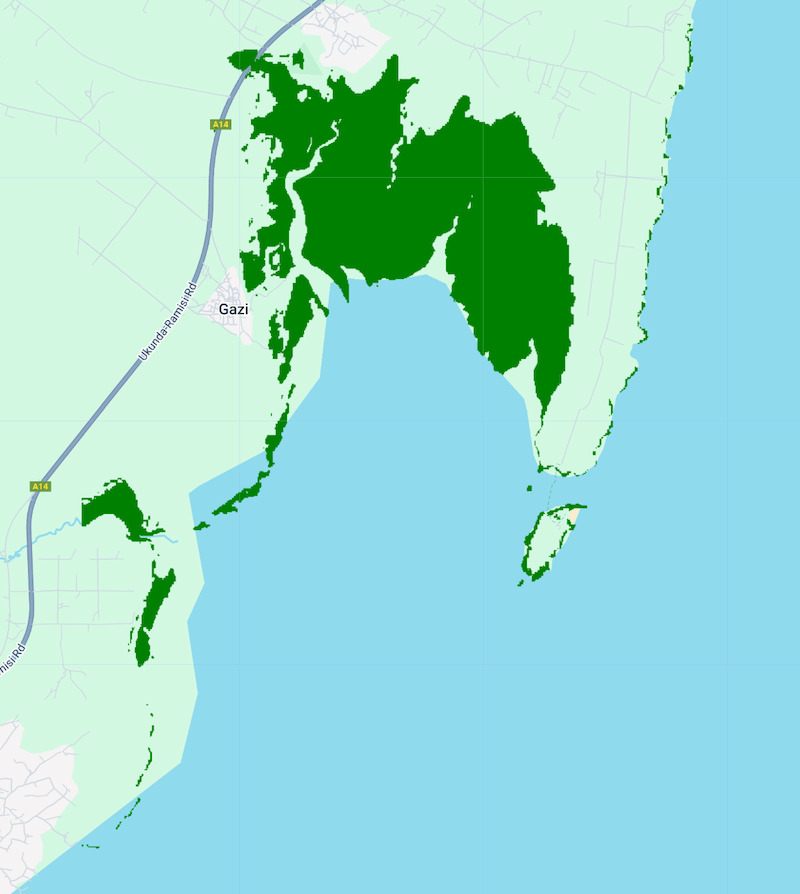 Чтобы оценить наши результаты, мы можем сравнить их с высококачественным рецензируемым набором данных: Global Mangrove Watch . Этот набор данных был получен с помощью радиолокатора с синтезированной апертурой (SAR) L-диапазона от JAXA и содержит ежегодные карты мангровых зарослей за 1996–2020 годы. Этот набор данных доступен в каталоге сообщества GEE , поэтому мы можем легко загрузить его и визуализировать в Earth Engine.