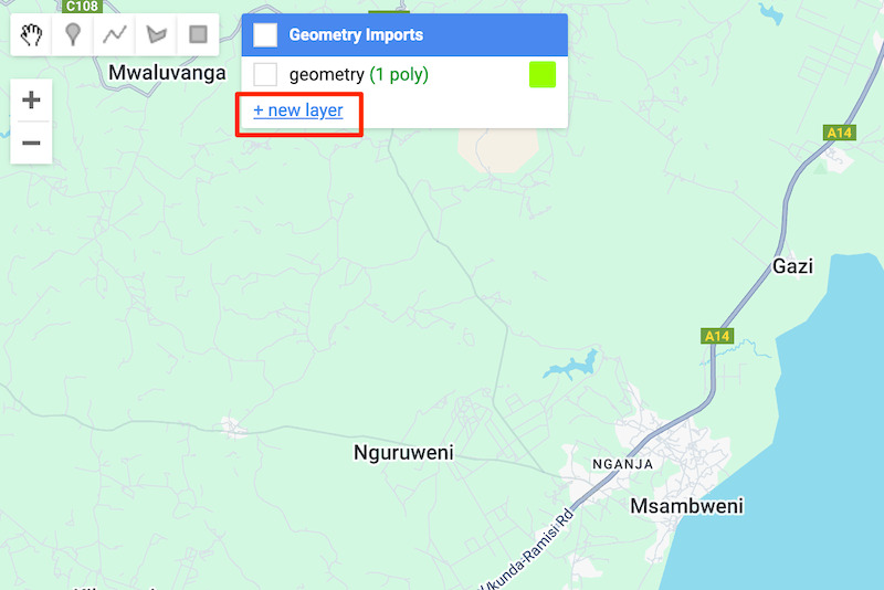 首先,請定義感興趣的區域。在本教學課程中,我們將沿著肯亞海岸線選取一個區域,並將多邊形定義為幾何變數。或者,您也可以使用程式碼編輯器中的繪圖工具,在感興趣的區域周圍繪製多邊形,並將其儲存為「匯入」中的幾何變數。