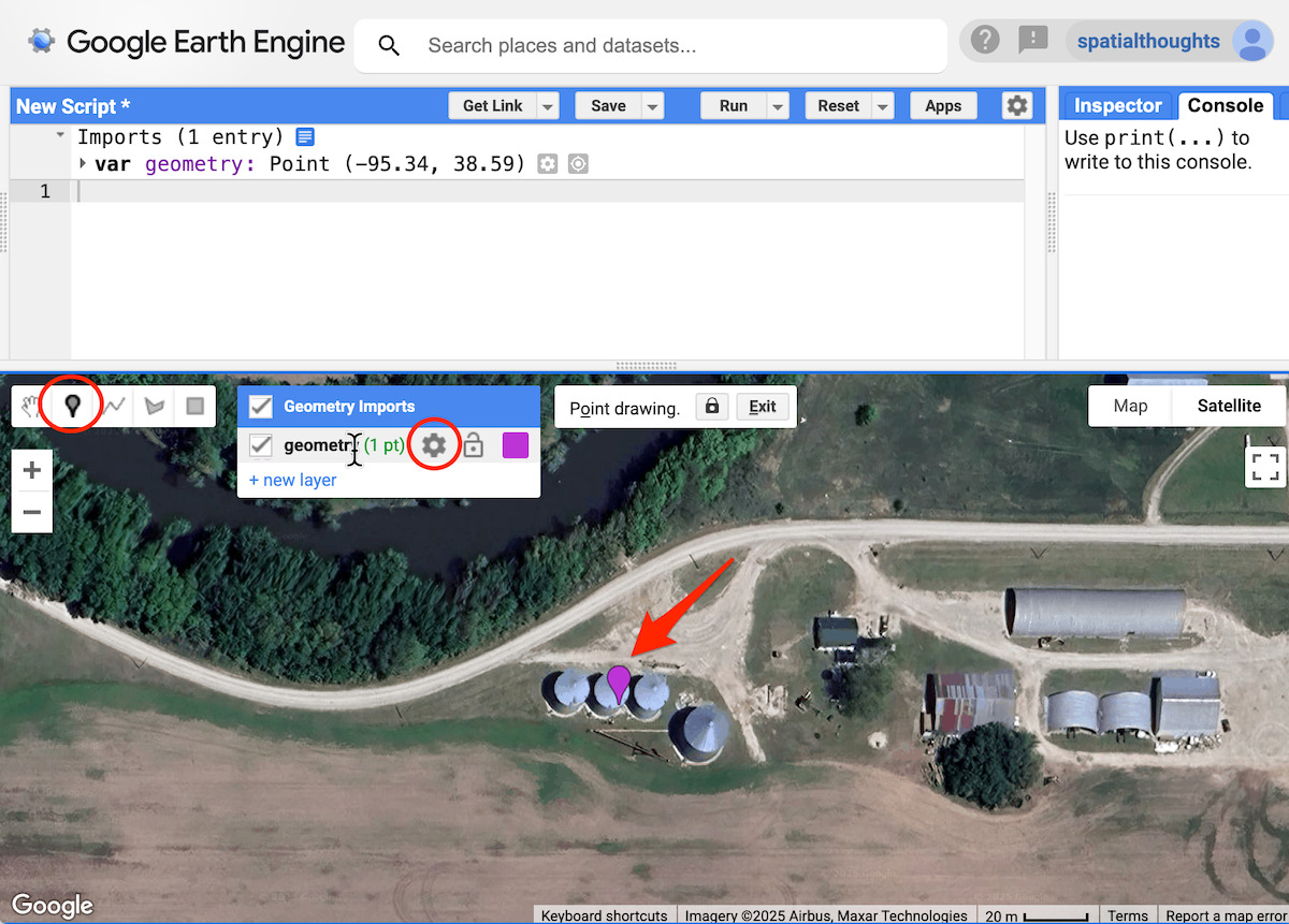 אנחנו מתחילים בסימון המיקום של ממגורות אחת או יותר. בכלי לעריכת קוד, אפשר להשתמש במפת בסיס של לוויין, שמאפשרת לאתר אובייקטים בקלות.
