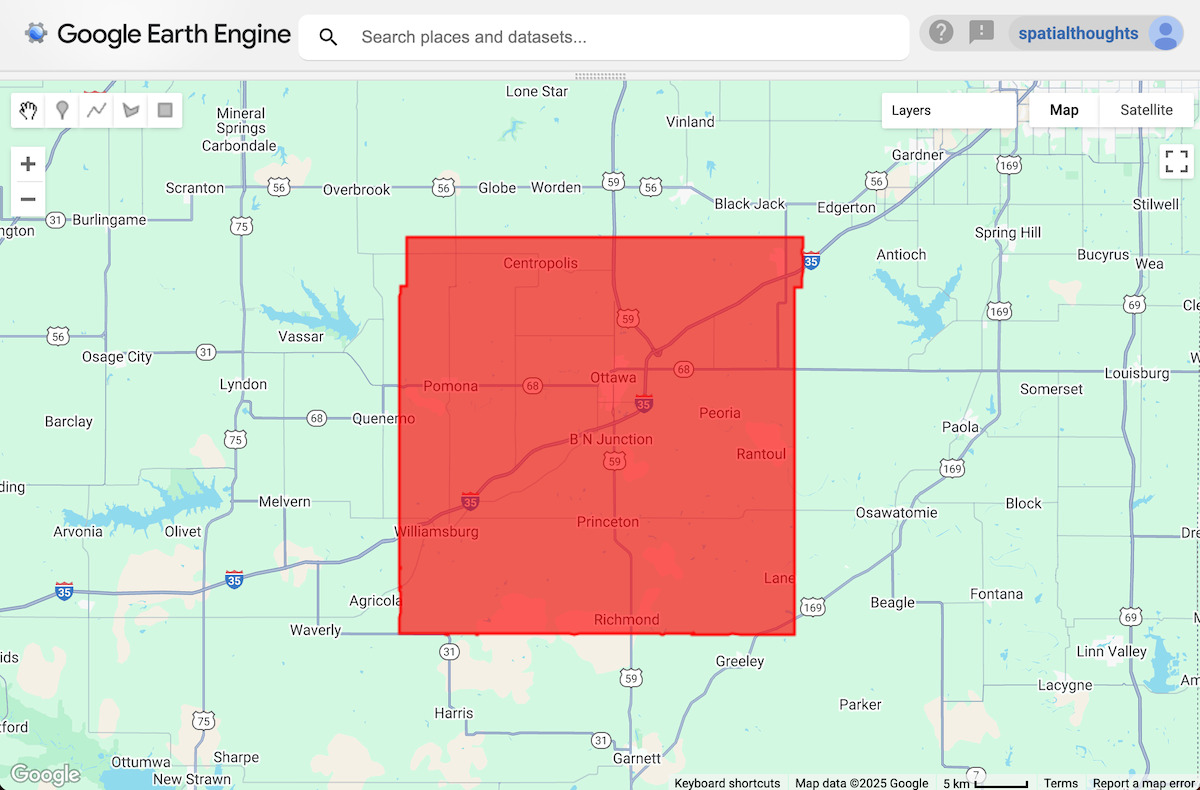 Trong hướng dẫn này, chúng ta sẽ lập bản đồ các hầm chứa ngũ cốc ở Quận Franklin, Kansas. Chúng tôi áp dụng một bộ lọc và chọn đa giác cho quận này.