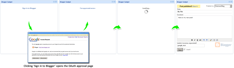 http://oauth.gmodules.com/gadgets/oauthcallbackvà cửa sổ sẽ đóng. - Tiện ích nhận ra cửa sổ đã đóng và tìm cách truy cập vào Blogger lần thứ hai bằng cách yêu cầu lại dữ liệu của người dùng. Để phát hiện cửa sổ đóng, tôi đã dùng một trình xử lý cửa sổ bật lên. Nếu bạn không sử dụng mã như vậy, người dùng có thể nhấp vào "Tôi đã phê duyệt quyền truy cập" theo cách thủ công.