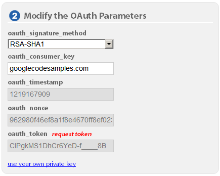 | نمونه درخواست HTTP | GET http://www.google.com/calendar/feeds/default/allcalendars/full?orderby=starttime HTTP/1.1 Host: http://www.google.com Content-Type: application/atom+xml Authorization: OAuth oauth_token="1%2Fab3cd9j4ks73hf7g", oauth_signature_method="RSA-SHA1", oauth_signature="wOJIO9AvZbTSMK%2FPY%3D...", oauth_consumer_key="example.com", oauth_timestamp="137131200", oauth_nonce="4572616e48616d6d", oauth_version="1.0" |