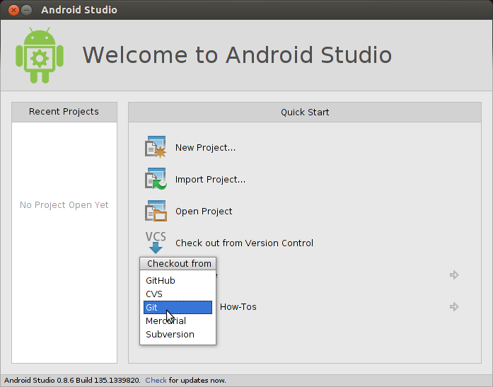 1. Klicken Sie auf Check out from Version Control > Git (Aus Versionskontrolle > Git auschecken).