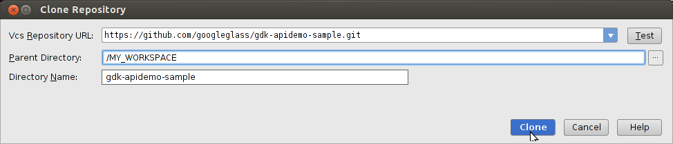 2. Verwenden Sie eine der Klon-URL der Beispiele im Feld Vcs-Repository-URL (Beispiel: https://github.com/googleglass/gdk-apidemo-sample.git).
