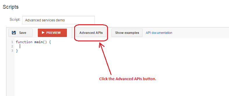 如需查看哪些 Google API 可作为高级 API 使用,请点击顶部编辑器栏中的高级 API 按钮。