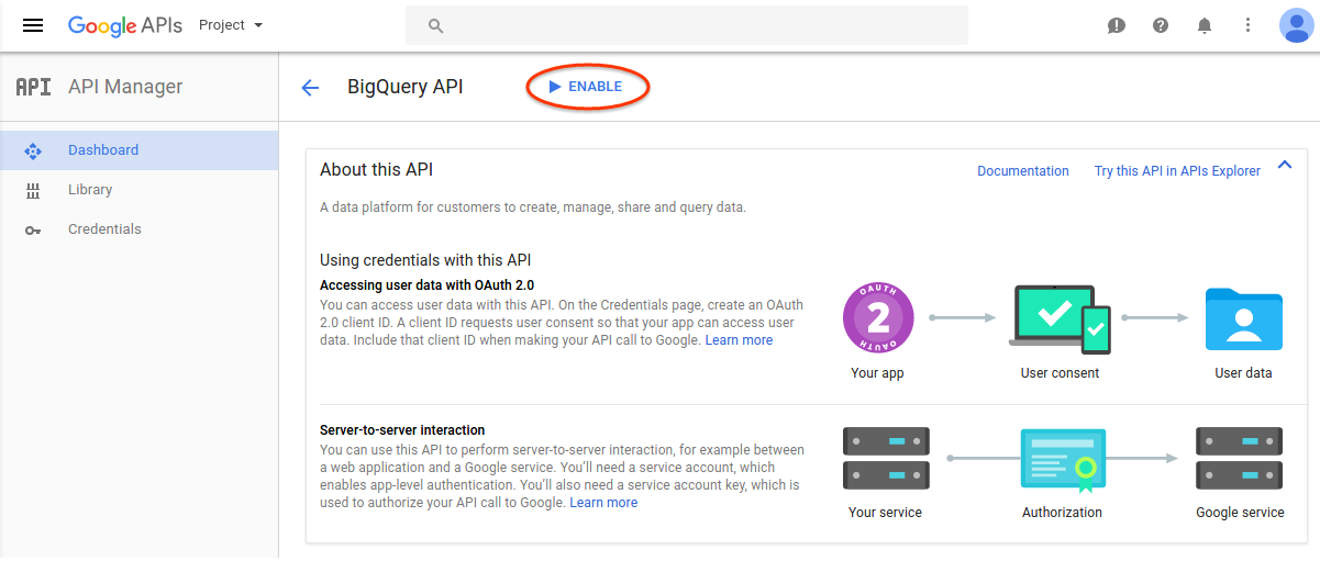 如需查看为项目启用的 API 列表,请选择信息中心页面。验证您要用于脚本的所有高级 API 是否都已列出。