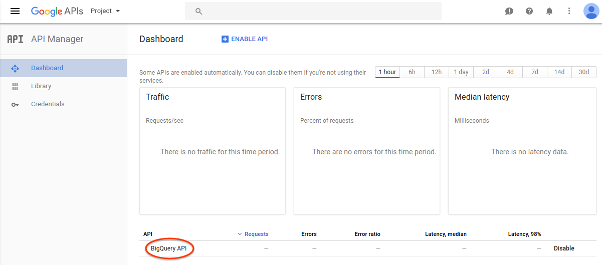 如需查看为项目启用的 API 列表,请选择信息中心页面。验证您要用于脚本的所有高级 API 是否都已列出。