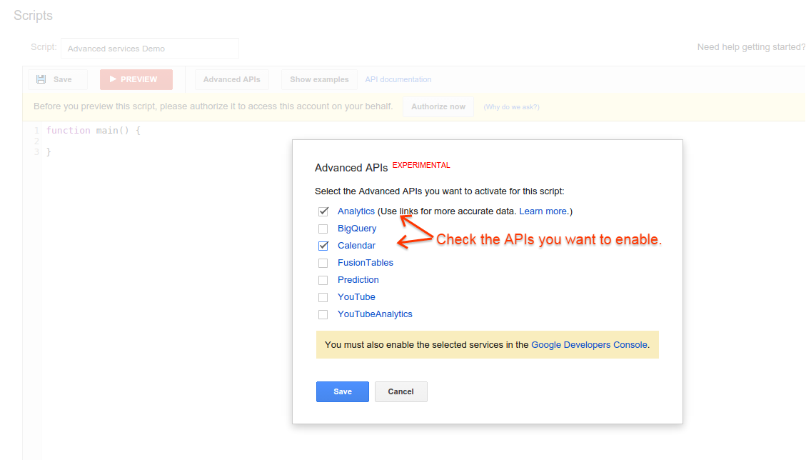 如需查看哪些 Google API 可作为高级 API 使用,请点击顶部编辑器栏中的高级 API 按钮。