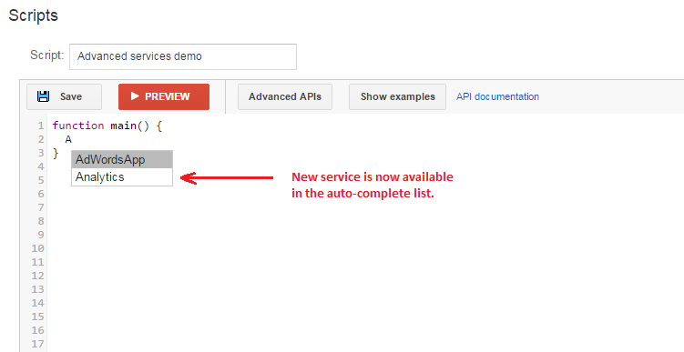Google Ads 脚本中的高级 API 可让经验丰富的开发者连接到某些公共 Google API,所需设置比使用其 HTTP 接口少。您使用这些 API 的方式与使用脚本的内置服务非常相似,它们还提供相同的便利功能,例如自动补全和自动授权。