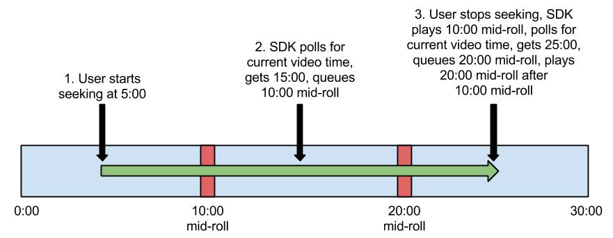 Jeśli korzystasz z reguł reklamowych, możesz napotkać problem z przewijaniem za pomocą kliknięcia i przeciągnięcia. W szczególności po kliknięciu i przeciągnięciu wskaźnika w celu przewinięcia filmu poza kilka bloków reklamowych w trakcie filmu użytkownik może zobaczyć 2 lub więcej takich bloków odtwarzanych jeden po drugim, zanim odtwarzanie treści zostanie wznowione. Jest to spowodowane aktualizacją czasu odtwarzania filmu, gdy użytkownik przewija film. Jeśli SDK w trakcie przewijania przez użytkownika filmu poza reklamę odpyta o bieżący czas, może uznać, że należy odtworzyć reklamę. Gdy odtwarzanie treści zostanie wznowione, wyświetli tę reklamę, a potem najnowszą reklamę od momentu przewinięcia. Ilustrację tego problemu znajdziesz na tym diagramie: