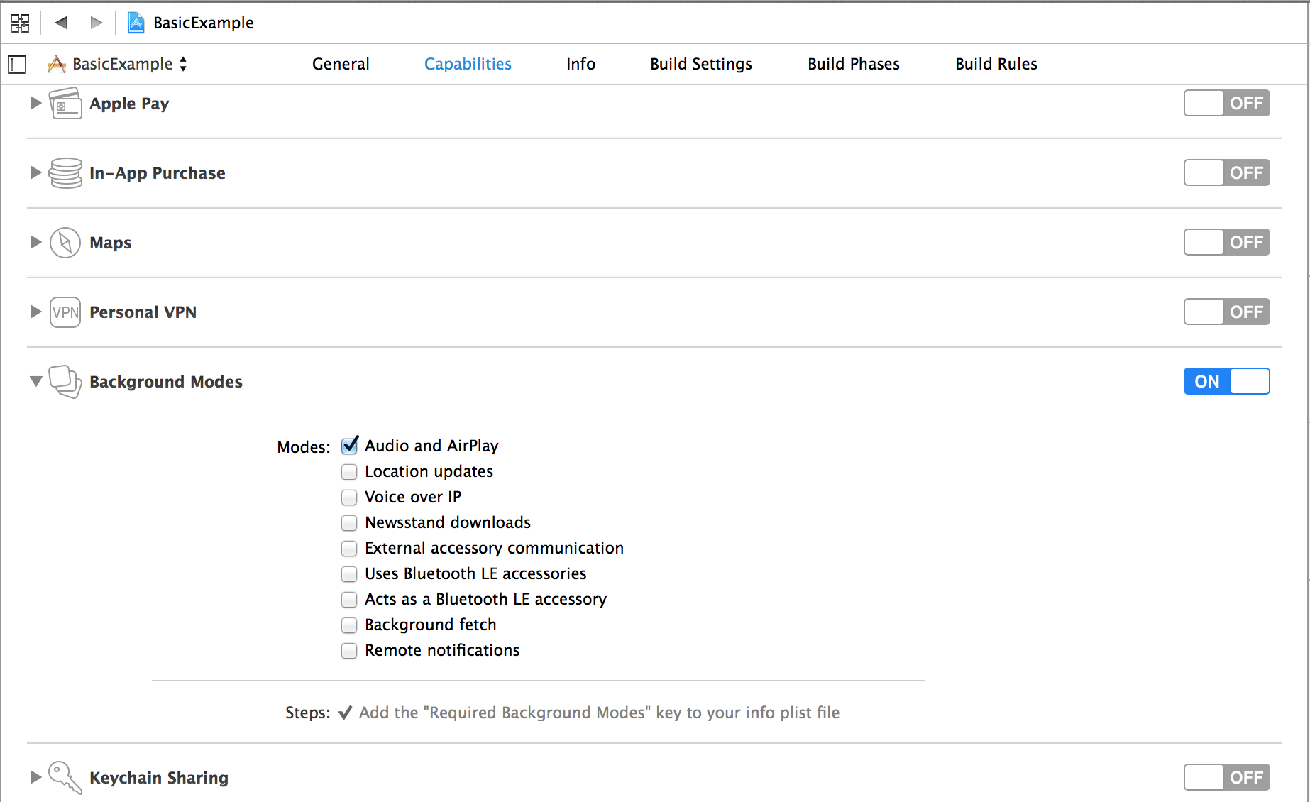 1. Attiva la modalità in background Audio e Airplay. In Xcode 6, seleziona un target, quindi sotto Funzionalità > Modalità in background, attiva "Audio e Airplay".