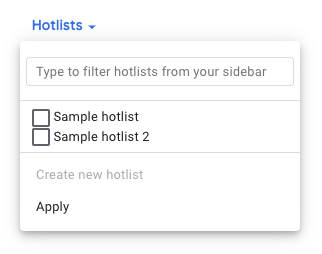 Você pode criar uma lista de favoritos ou filtrar a atual digitando palavras-chave no campo de texto Type to filter hotlists from your sidebar na parte de cima do seletor de listas de favoritos. A pesquisa corresponde as listas de acesso rápido às palavras-chave no título, mas não na descrição. Para criar uma lista de palavras-chave com as palavras-chave que você digita na barra de pesquisa, clique em Criar nova abaixo do campo de pesquisa. Só é possível criar uma hotlist no seletor se as palavras-chave não corresponderem exatamente a um resultado da pesquisa. Quando você cria uma lista de problemas no seletor de listas de problemas, o problema associado é adicionado automaticamente à lista.