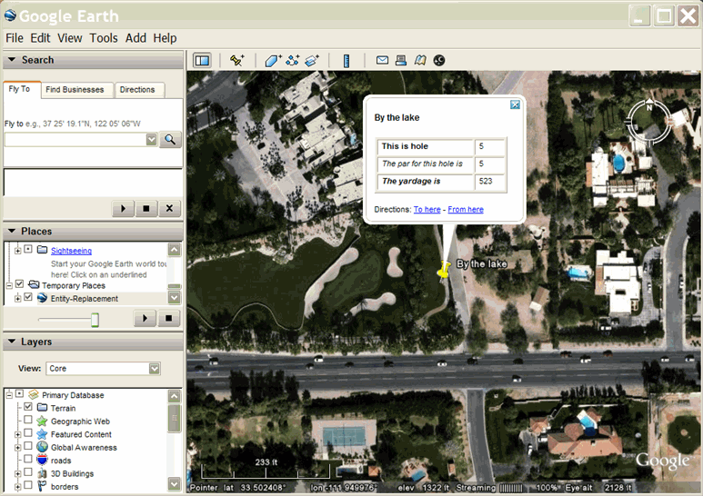 Here is an example of a Placemark that contains custom data about several holes in a golf course: