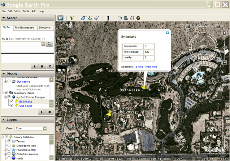 </Placemark> <Placemark> <name>By the lake</name> <ExtendedData> <Data name="holeNumber"> <value>5</value> </Data> <Data name="holeYardage"> <value>523</value> </Data> <Data name="holePar"> <value>5</value> </Data> </ExtendedData> <Point> <coordinates>-111.95,33.5024</coordinates> </Point>