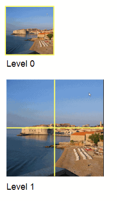 ภาพประกอบต่อไปนี้แสดงระดับ 0, 1 และ 2 ของพีระมิดรูปภาพตัวอย่าง