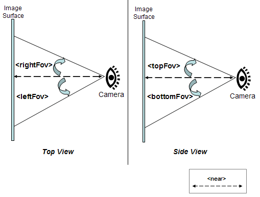 แผนภาพต่อไปนี้แสดงมุม <rightFov> และ <leftFov> ("มุมมองด้านข้าง") และมุม <topFov> และ <bottomFov> ("มุมมองด้านบน") ของพีระมิดนี้