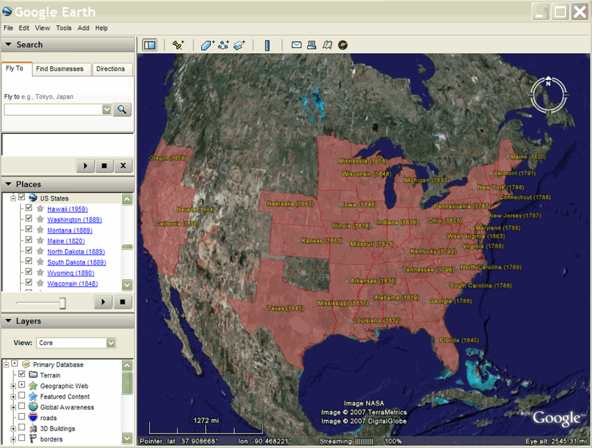 ব্রায়ান ফ্লাড একটি আকর্ষণীয় KML প্রেজেন্টেশন তৈরি করেছে যা ইউনাইটেড স্টেটের বৃদ্ধি দেখায় কারণ রাজ্যগুলিকে ইউনিয়নে যুক্ত করা হয়েছিল৷ এখানে দেখানো KML ফাইলটি শুধুমাত্র একটি প্রারম্ভিক বিন্দু সহ TimeSpan অবজেক্ট ব্যবহার করে, যাতে একটি স্টেট (বহুভুজ) ডিসপ্লেতে রয়ে যায় একবার এটি যোগ করা হলে।