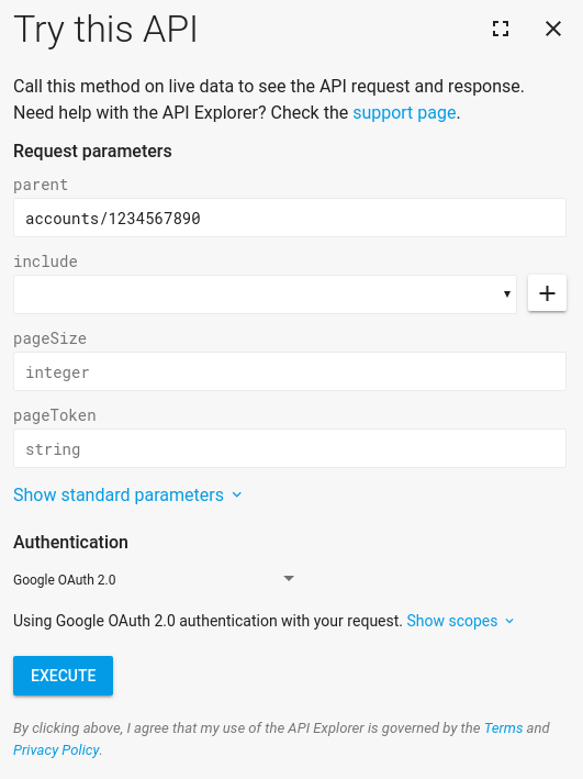 4. מזינים את הערך accounts/{account_id}, ומחליפים את {account_id} ב מספר חשבון Manufacturer Center שמשויך לחשבון Manufacturer Center שלך, בקטע 'הורה' בשדה של הטופס, ולוחצים על Execute.