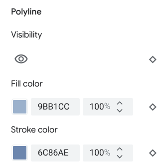 Largura do traço: a espessura do contorno de polígonos e polilinhas. Os resultados podem variar de acordo com o nível de zoom. Se você não quiser um destaque, defina a cor do traço com a mesma cor de preenchimento ou defina a largura do traço como 0.