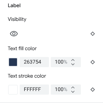 Para os tipos de elementos do mapa que são representados de forma total ou parcial por um rótulo, como Pontos de interesse ou Transporte, você pode estilizar os seguintes elementos: Visibilidade, Cor do ícone, Cor de preenchimento do texto e Cor do traço do texto.