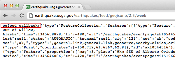 Например, откройте в браузере страницу http://earthquake.usgs.gov/earthquakes/feed/v1.0/summary/2.5_week.geojsonp , чтобы отобразить имя функции обратного вызова как eqfeed_callback .