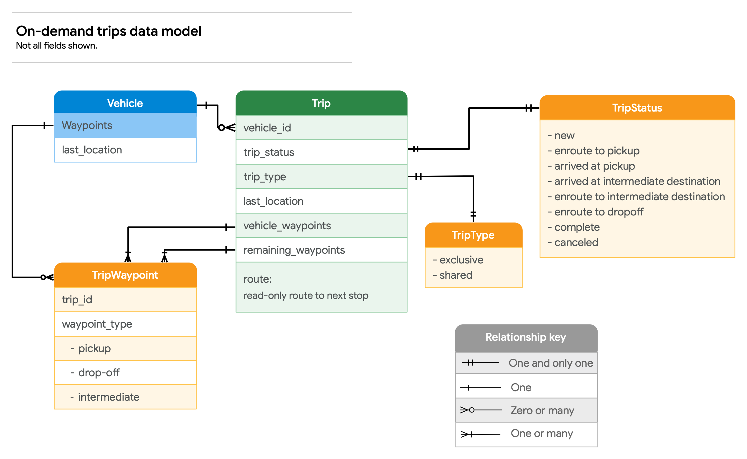 A medida que tu backend asigna viajes a los vehículos, también debe conocer los otros viajes programados para el vehículo. Por esa razón, en los siguientes diagramas, se ilustra el modelo de datos del recurso Trip