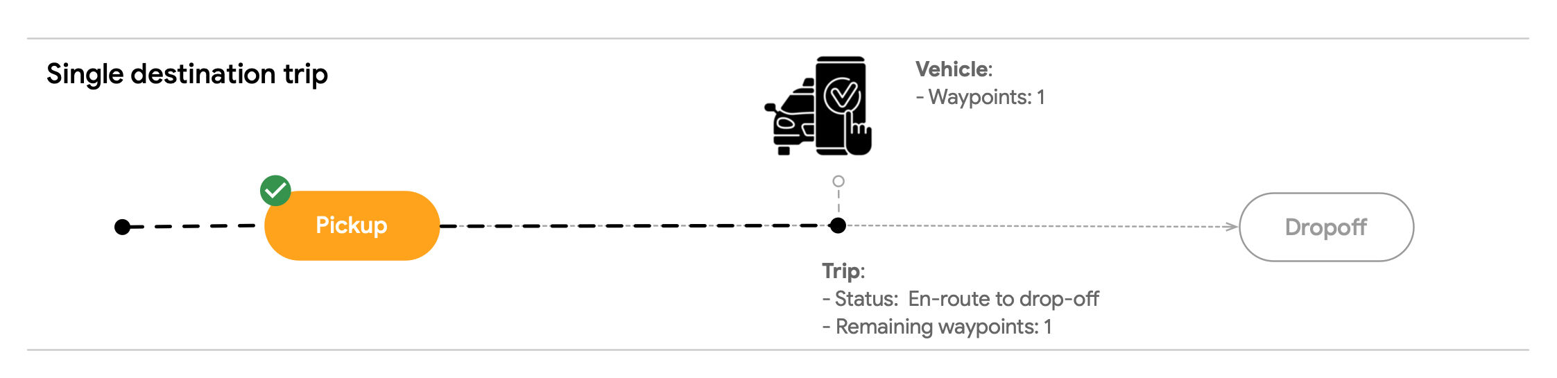 Durante il viaggio del veicolo, Fleet Engine rimuove un waypoint precedente del viaggio dall'elenco dei waypoint rimanenti del veicolo solo quando il veicolo segnala che è in viaggio verso la destinazione successiva o che il viaggio è stato completato. ovvero uno dei seguenti: