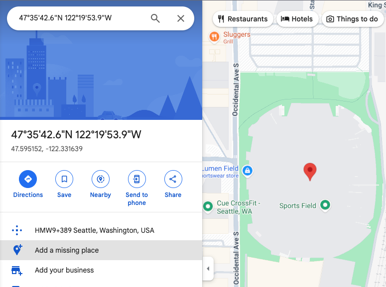 Esempio 3: la ricerca di Lumen Field utilizzando le coordinate di latitudine/longitudine e l'ID luogo restituisce la seguente mappa:
