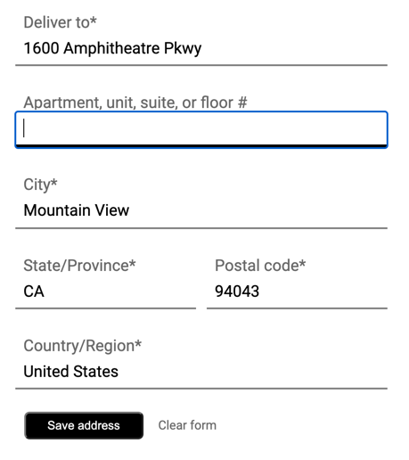 • 使字段保持可修改状态,以防匹配结果中缺失某些字段,并允许客户根据需要更新地址。由于地点自动补全功能返回的大多数地址都不包含 subpremise 编号(例如公寓、套房或单元编号),因此本示例重点关注地址行 2,鼓励用户根据需要填写相关信息。