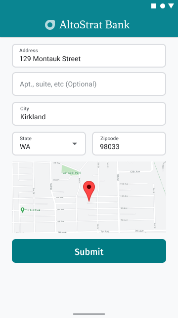 כשהמשתמש בוחר כתובת מתוך רשימת החיזויים, אפשר להשתמש בתגובה כדי לאמת את הכתובת ולקבל את המיקום. לאחר מכן, האפליקציה יכולה לאכלס את השדות הנכונים בטופס הזנת הכתובת, כמו שמוצג באיור הבא.