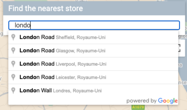 Si vous limitez les prédictions de Place Autocomplete aux types de géocodage, votre champ de saisie est configuré de manière à accepter les adresses postales, les quartiers, les villes et les codes postaux. Les utilisateurs peuvent ainsi choisir le niveau de précision pour décrire leur lieu de départ. Assurez-vous de demander le champ geometry pour que la réponse contienne la latitude et la longitude du lieu de départ de l'utilisateur. Ces coordonnées vous permettront de recentrer la carte, et d'indiquer le lien entre vos établissements et le lieu de départ.