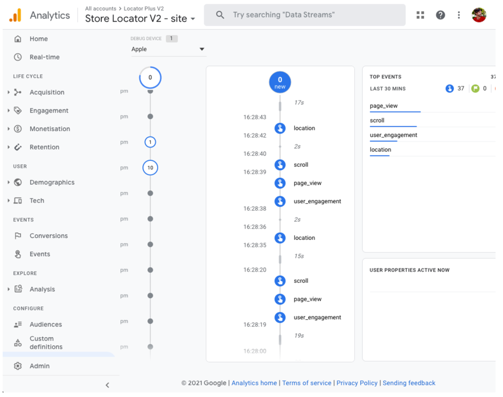 Vous pouvez également contrôler les événements en temps réel via DebugView, comme illustré ci-dessous. Notez que vous devez patienter 24 heures avant d'accéder à un rapport complet sur les événements dans la section Engagement > Événements de Google Analytics.