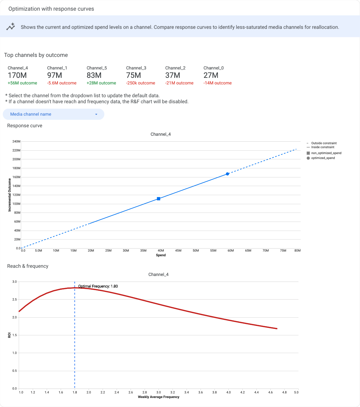 Selecciona un canal en la lista desplegable Nombre del canal de medios para ver la curva de respuesta correspondiente. Si los datos de alcance y frecuencia están disponibles para un canal, el gráfico correspondiente se actualiza de forma automática con esa información; en cambio, si no están disponibles, ese gráfico se inhabilita.