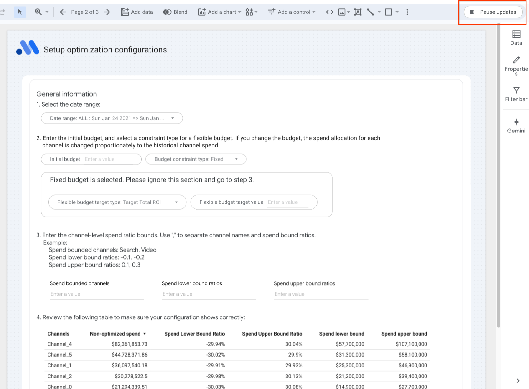| ‼️La página de configuración de la optimización del presupuesto recopila datos de entrada a través de diferentes pasos. Para evitar cualquier conflicto de configuración y cálculo innecesario, es recomendable utilizar el informe en modo de edición, detener su proceso de cálculo antes de cualquier configuración y reanudar ese proceso una vez finalizada la configuración para activar la actualización del informe. Para obtener más detalles, consulta Cómo detener las actualizaciones del informe. |