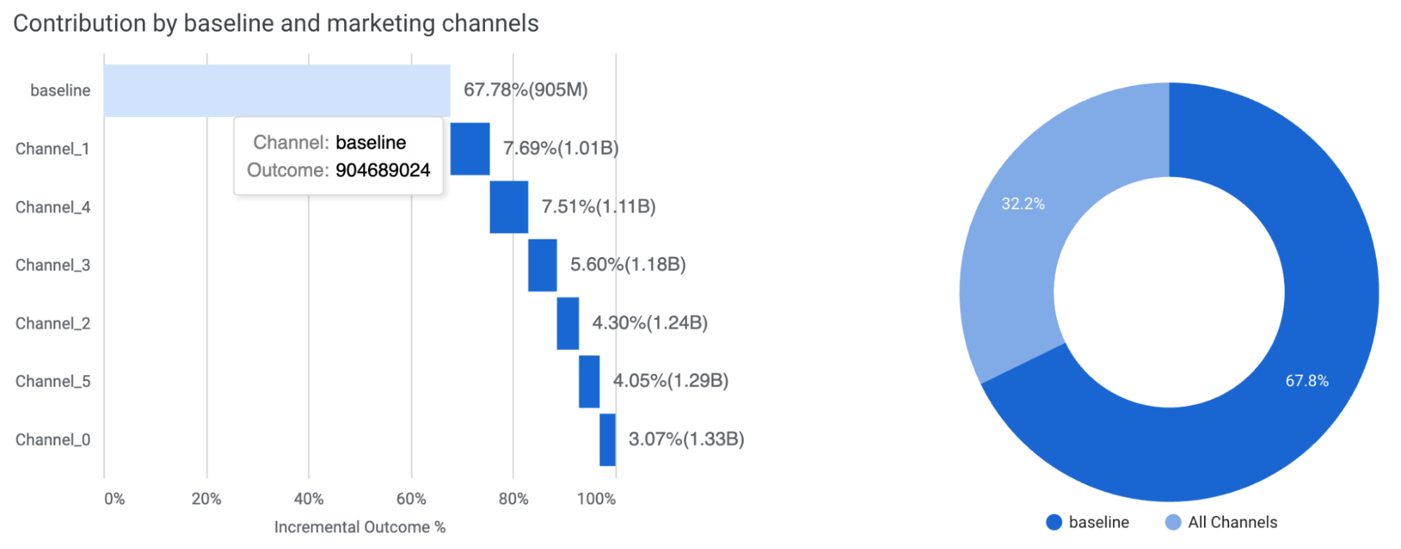 A seção Contribuição do canal fornece uma análise do impacto das suas atividades de mídia e que não são de mídia na performance da receita ou do KPI. É possível comparar métricas importantes, como retorno do investimento (ROI) e porcentagem do gasto e da receita ou KPI incremental em diferentes canais, e também detalhar a contribuição por valor de referência, promoções de preço e vários canais de marketing.