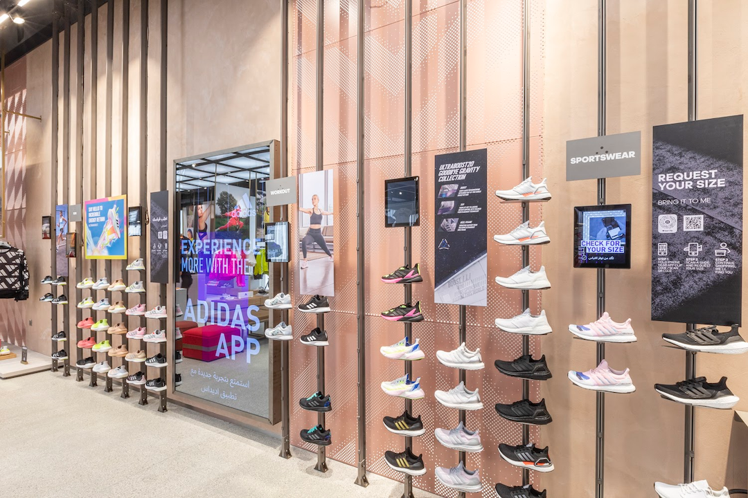 En una tienda minorista de adidas, los consumidores desean saber si hay calzados disponibles en talle. Mientras que los asociados de la tienda de adidas tienen tablets para consultar el inventario de inventario en tiempo real, la aplicación de adidas permite que los consumidores se revisen a sí mismos.