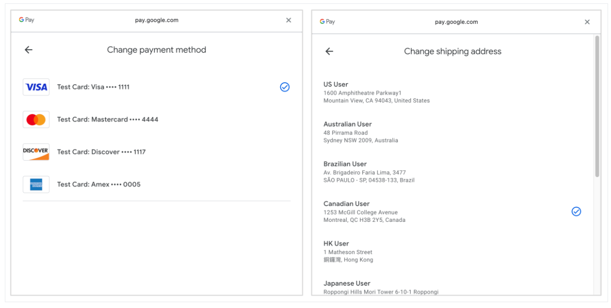Lorsque vous utilisez la suite de tests avec une passerelle éligible, celle-ci affiche une liste de cartes de test au lieu de notre suite de cartes de test fictives. Lorsque le flux de la feuille de paiement génère l'objet PaymentData, la valeur de la carte sélectionnée est chiffrée dans le jeton fourni. Cela vous permet de transmettre la valeur de la carte sélectionnée à l'environnement de test de la passerelle et de recevoir la réponse attendue.