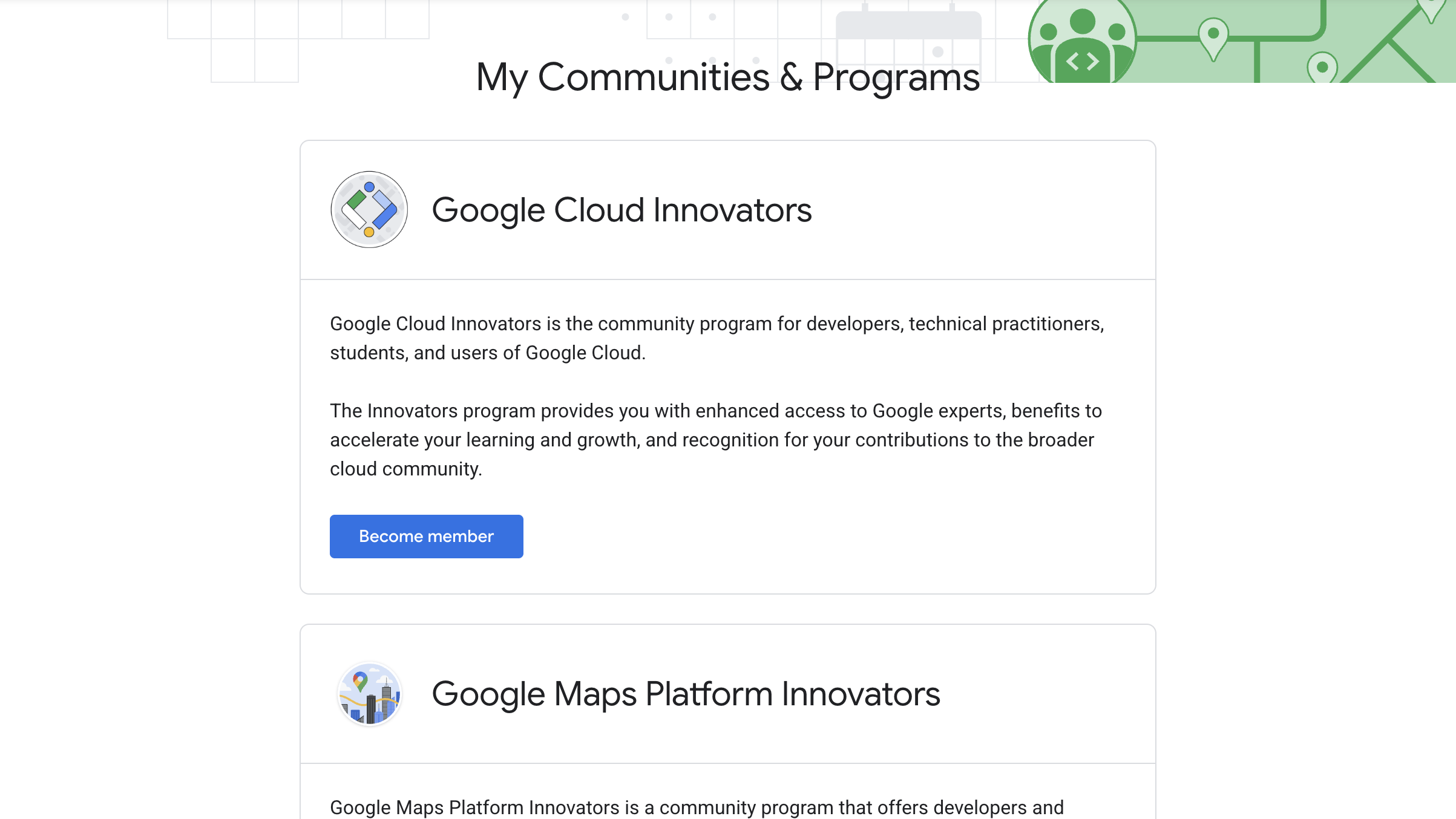 Google Cloud Innovators 및 Google Maps Platform Innovators와 같은 그룹에 가입하세요. 리소스를 공유하고, 소통하며, 다른 사용자와 공유할 공개 프로필을 만드세요.